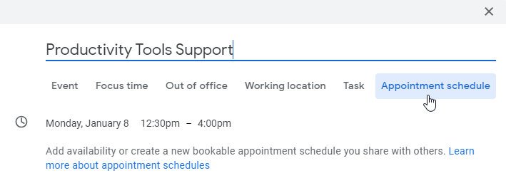 - Create a new meeting within your calendar and select Appointment Schedule, choose to add this slot of time to an existing schedule you’ve previously created or to create a new schedule, then select the “Continue” button