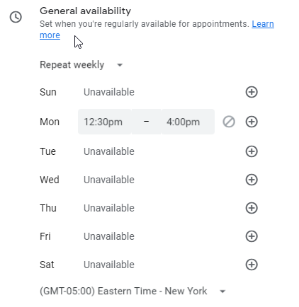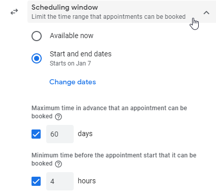 - Set the desired duration for how long someone can book you during this time, choose any recurring availability, set parameters on how far in advance someone can book time with you or the minimum amount of time before an appointment someone can book