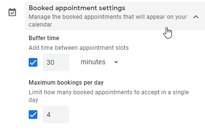 - Choose to add buffer time to prevent back-to-back appointments and/or add a maximum number of bookings per day