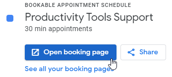 - Select “Save” - in the newly created appointment schedule, you can then see the booking page link and send that to anyone who might need to book time with you through this feature